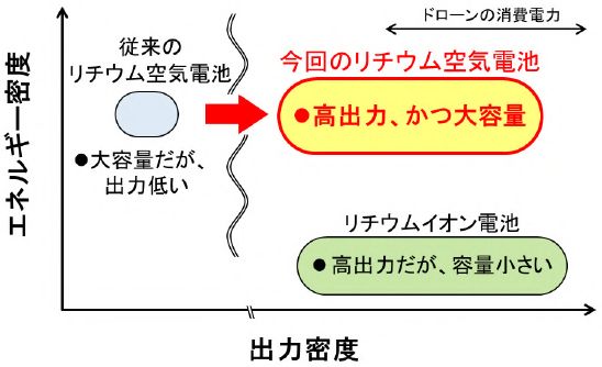 今回、研究チームはリチウム空気電池の高出力化に必要な電極を開発しました。カーボンナノチューブを用いて電極を高空隙化することで、酸素の高効率吸収が可能となりました。さらにこの電極を酸素の拡散輸送に優れる電解液と組み合わせることで、従来に比べて1ケタ以上の出力電流向上に成功しました。このリチウム空気電池の重さあたりの出力密度を調べたところ、ドローンがホバリングに必要とする電力を供給できることが分かりました。